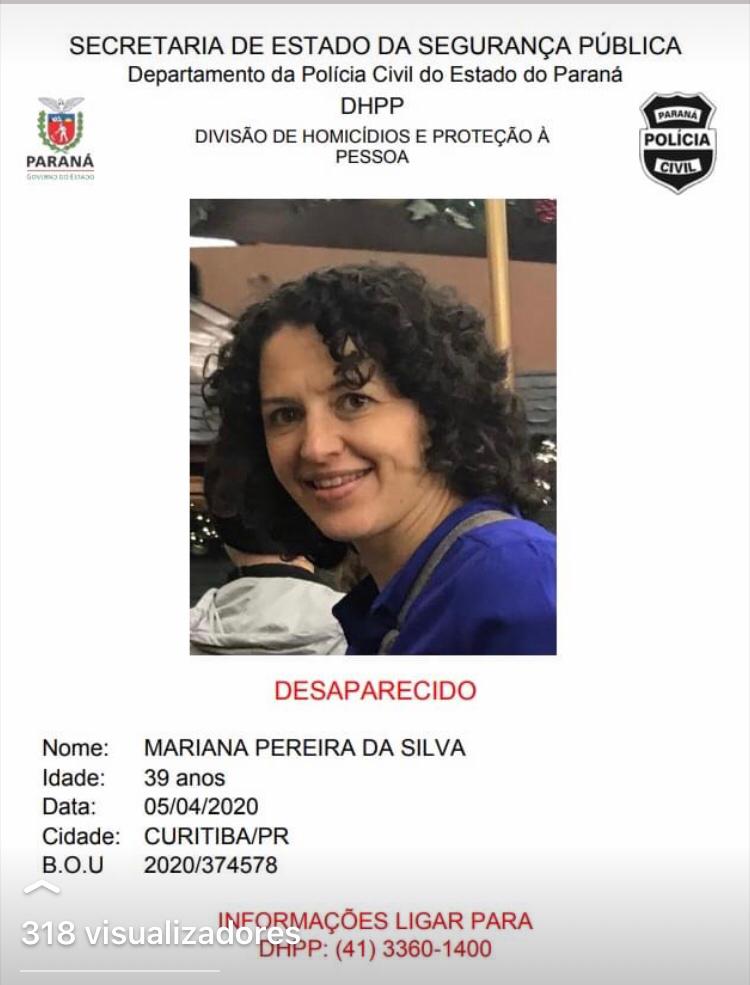 A engenheira civil Mariana Pereira da Silva, 39 anos, desapareceu no começo da tarde de domingo (5), em Curitiba. A última informação é que ela estaria retornando para casa, no bairro Água Verde, onde reside com os pais. No entanto, até o início da tarde desta segunda-feira (6), os familiares não tinham notícias do paradeiro de Mariana. O carro que ela dirigia foi encontrado na tarde desta segunda-feira.