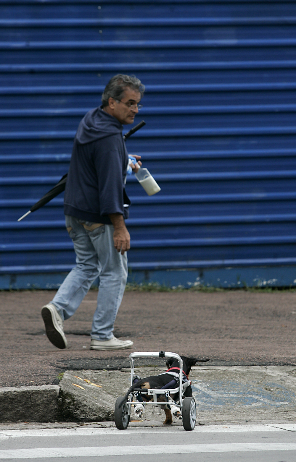 Andando pelas ruas do Bairro Água Verde, já saindo da pauta agendada, nos deparamos com uma imagem de encher os olhos. A vizinhança já está acostumada com a presença de Scooby-Doo, um cão da raça Dachshund, mas o pequeno “cofapinho” é atração por onde passa. Com uma cadeira de rodas adaptada para substituir as patas traseiras, Scoob desfila pelas ruas sem quaqluer dificuldade. As rampas de acesso nas esquinas facilitam a caminhada do bichinho. A adpatação foi feita depois que Scoob perdeu os movimentos das pernas por calcificação em algumas vértebras da coluna. O registro do Scoob ficou por conta do fotógrafo Marco Lima, companheiro nos Caçadores de Notícias na tarde desta sexta-feira