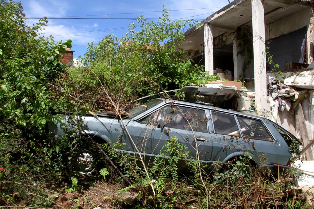 Quem passa na frente do número 1.676 da Rua Rio Xingu, no Bairro Alto, não imagina que por trás do portão cinza há um cenário assustador. A frente foi recentemente roçada, mas, nos fundos, há um sobrado prestes a desabar. A estrutura do imóvel cedeu e ele ameaça cair em cima do quintal do vizinho, o autônomo Rogério Luiz Teixeira, 32 anos. Há mato por todo lado, lixo acumulando água da chuva e seis automóveis abandonados.