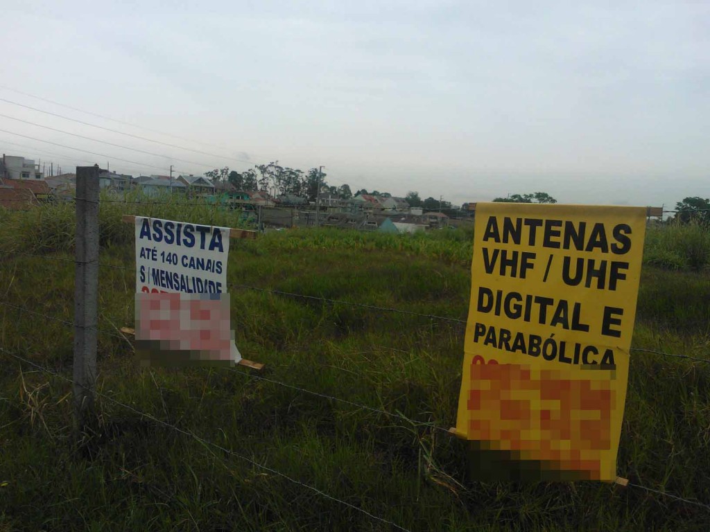 Não é difícil encontrar placas de publicidade oferecendo a instalação de tv a cabo pirata, nas ruas do Bairro Alto. Elas oferecem mais 140 canais e sem mensalidade. Só nesta manhã de terça-feira (25), a reportagem da Tribuna encntrou mais de 10 delas espalhadas pelo bairro.