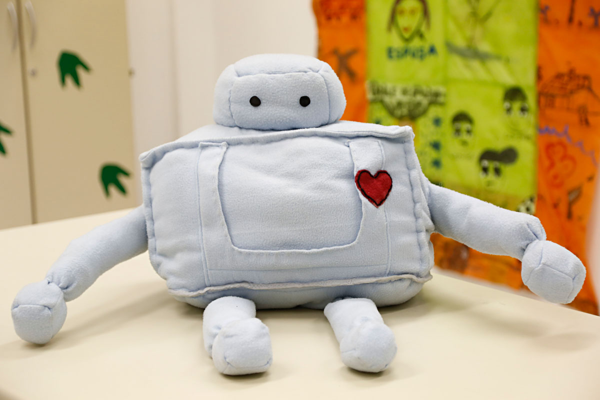 Construído com esqueleto de Lego e dispositivos eletrônicos e um sensor que é ativado ao toque do corpo, o robô fecha os braços, num abraço. “Na escola, tínhamos uma colega com autismo. Por isso decidimos pesquisar essa área. Descobrimos que os autistas têm dificuldades em manter contato físico e o robô pode facilitar isso. Ele tem um suporte para um tablet, para a criança pode fazer atividades”, conta Juan Gabriel Cardoso Ferreira, 13 anos. Com o Teabot, a equipe venceu a etapa regional do FLL e foi para a etapa nacional, em Brasília.