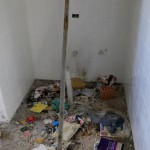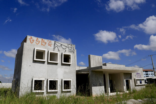 O mato alto toma conta do terreno e a estrutura que abrigaria o material para as obras está caindo aos pedaços. No interior da construção, as salas que receberiam os pacientes estão tomadas pela sujeira. Algumas estão danificadas e têm marcas de incêndio.