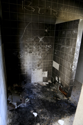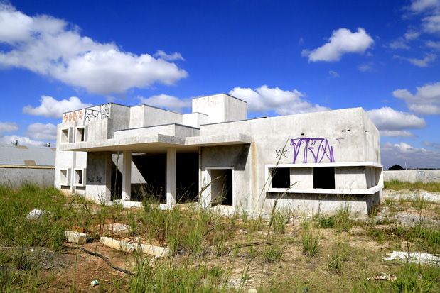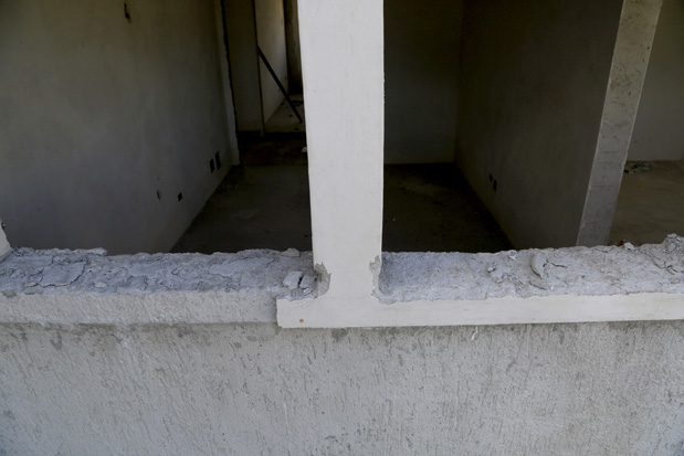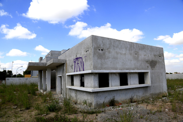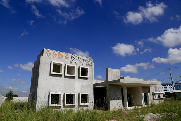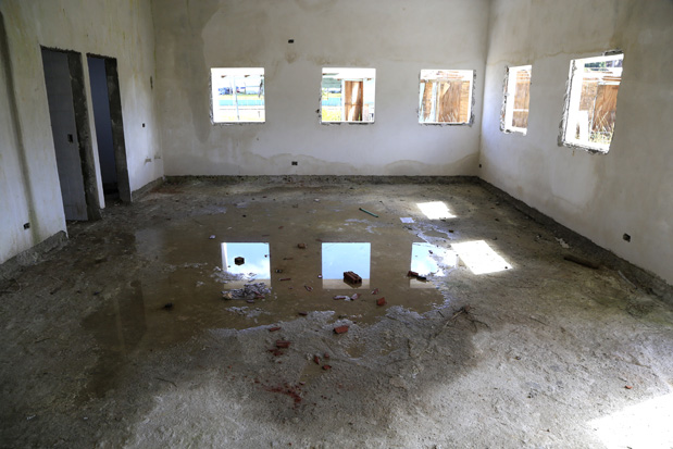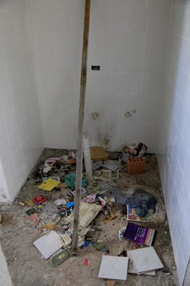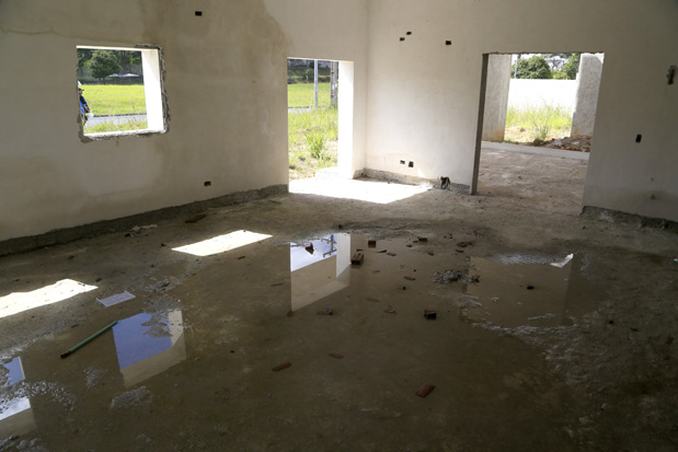 O mato alto toma conta do terreno e a estrutura que abrigaria o material para as obras está caindo aos pedaços. No interior da construção, as salas que receberiam os pacientes estão tomadas pela sujeira. Algumas estão danificadas e têm marcas de incêndio.