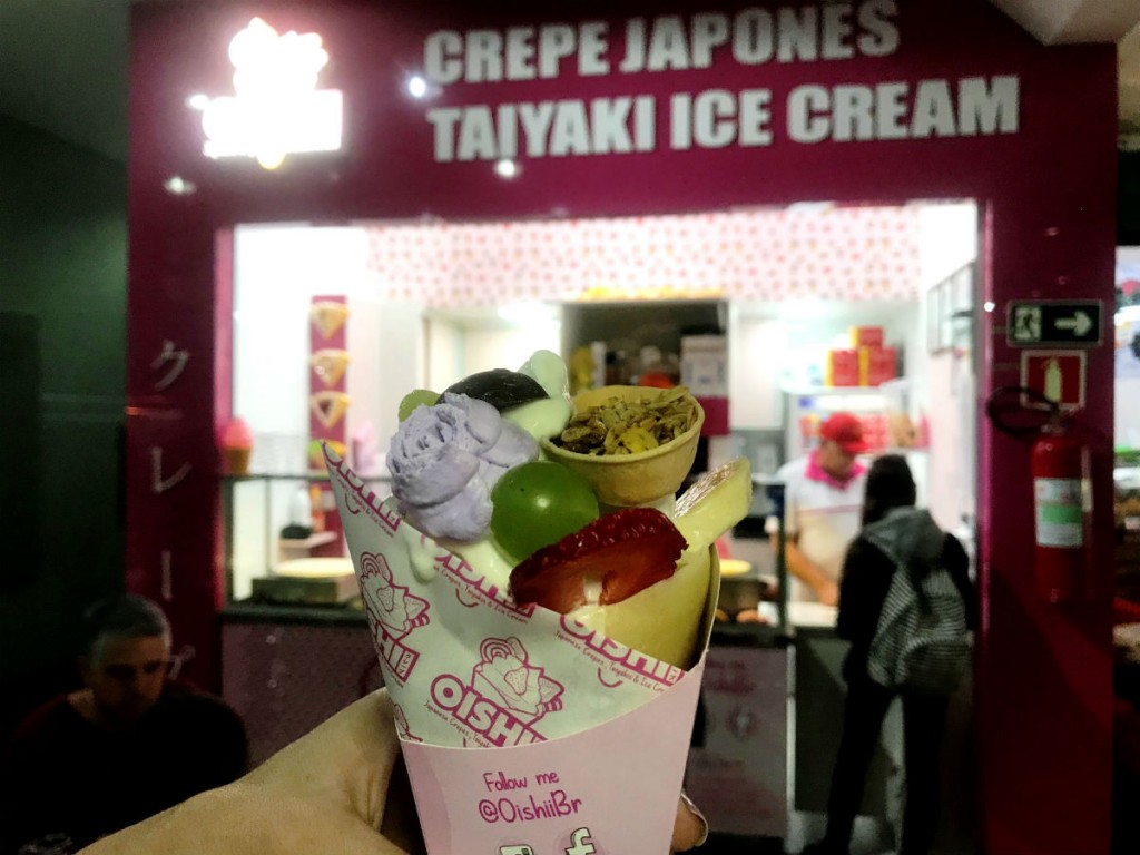 Junto com o sorvete de matcha, a Oishii Japanese Crepes & Ice Cream trouxe uma sobremesa que é uma das atrações no Japão: o taiyaki ice. “É um waffle, que tem o formato de peixe. Ele vem recheado com chocolate e você escolhe quais os confeitos que quer e o sorvete: baunilha, matcha ou misto. Tem sido uma grande atração por aqui também, porque as pessoas ainda não conheciam”.