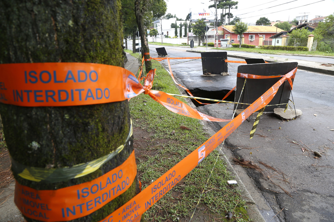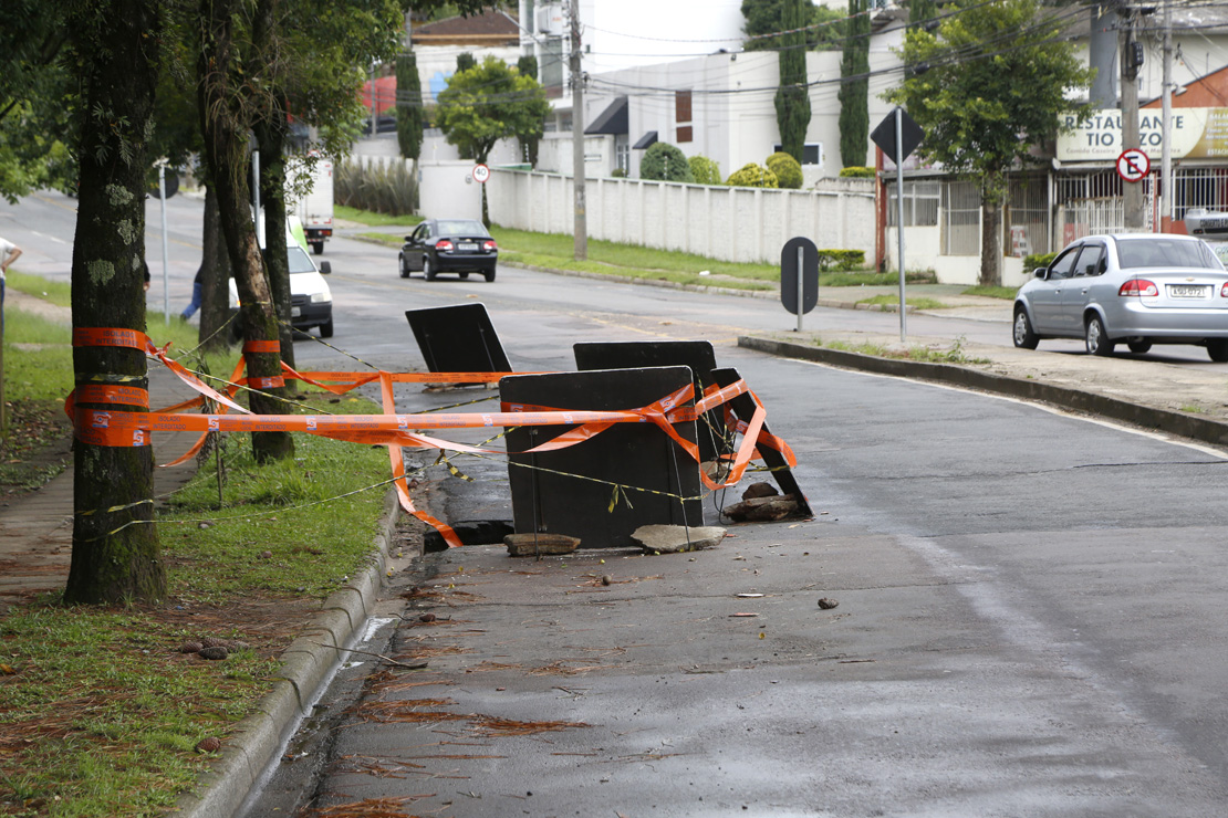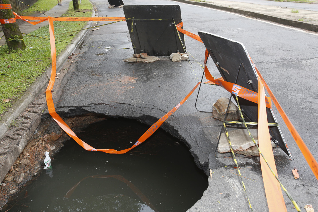 Durante o temporal, que durou duas horas, foram 118,4 milímetros de chuva, número muito próximo ao esperado para o mês todo de fevereiro. Com um volume tão alto em tão pouco tempo, ruas alagaram, árvores caíram e asfaltos ficaram destruídos. Em um registro feito pelo fotógrafo Átila Alberti, da Tribuna, é possível notar que o “buraco” está repleto de água e que a preocupação de alguns é justificável. Na via passam diversos ônibus, carros, pedestres e até mesmo ciclistas. O receio é que, mesmo com uma sinalização feita pela Prefeitura, um acidente aconteça, já que houve a ruptura de uma galeria pluvial.