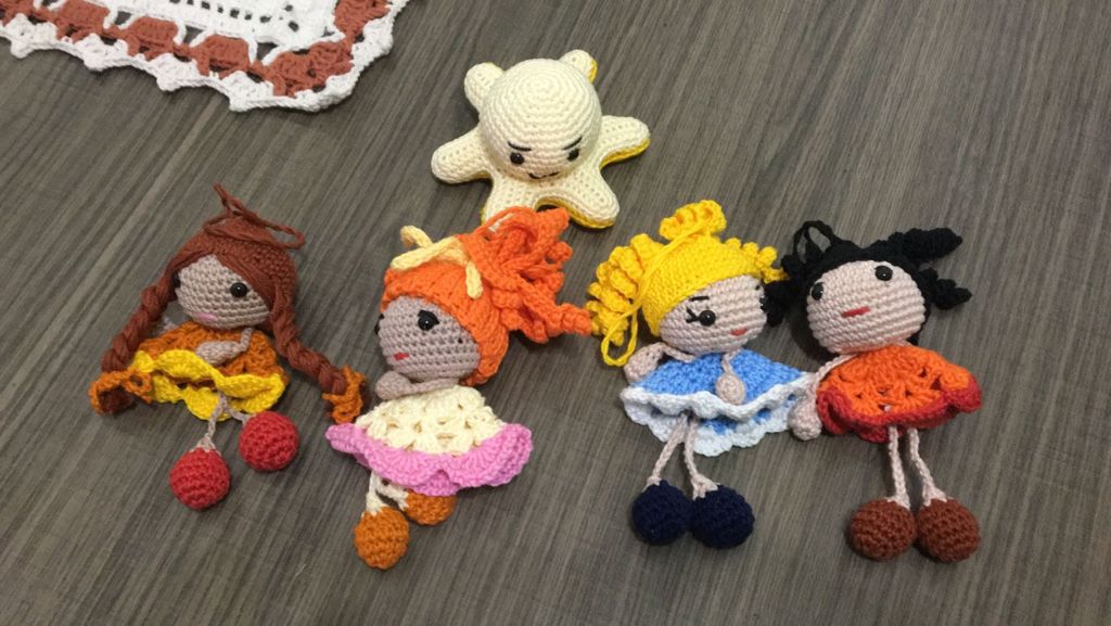 A habilidade para fazer os bonecos com a técnica japonesa vem da infância. A artista prestava atenção no que a mãe dela fazia e pedia para ser ensinada. “É crochê. A minha mãe fazia toalhinha, bordado, barra de toalha de mesa, de pano de prato. E você aprendendo crochê, você pode aprender a fazer outras coisas, que foi o meu caso com os amigurumi. Até hoje, com 84 anos, minha mãe ainda faz barrinha de pano de prato”, explica a artista.