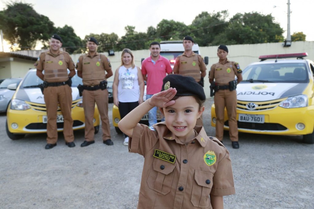 Entre Ben 10 ou Homem Aranha, Rainha Elsa ou a Barbie, toda criança costuma eleger algum ídolo para adorar durante a infância. Contudo, existem aquelas crianças que desde cedo já escolhem outro tipo de herói, digamos assim, um tanto mais reais. É o caso da pequena Beatriz Pallar da Cruz, de apenas 5 anos, moradora de Araucária. Ela gosta mesmo é da Polícia Militar e, assim como seus heróis, quer um dia prender muitos bandidos e trabalhar a favor da lei. E o amor pela corporação é tão grande, que o seu pedido de aniversário era ganhar uma farda, com lanterna, algema e uma arminha de brinquedo. Com exceção da arma, ela teve o restante do sonho realizado, pelos próprios policiais militares de Araucária.