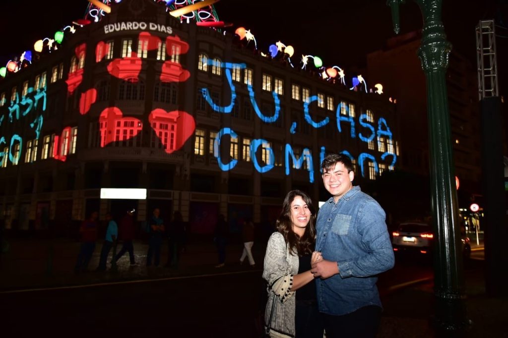 A projeção de um pedido de casamento no Palácio Avenida comoveu o público que acompanhava a tradicional apresentação de Natal no Centro de Curitiba na noite de terça-feira (17). O professor de educação infantil Eduardo Dias, 23 anos, pediu a mão da namorada Julia Ramos Ening, 22 anos, de um jeito para lá de romântico.