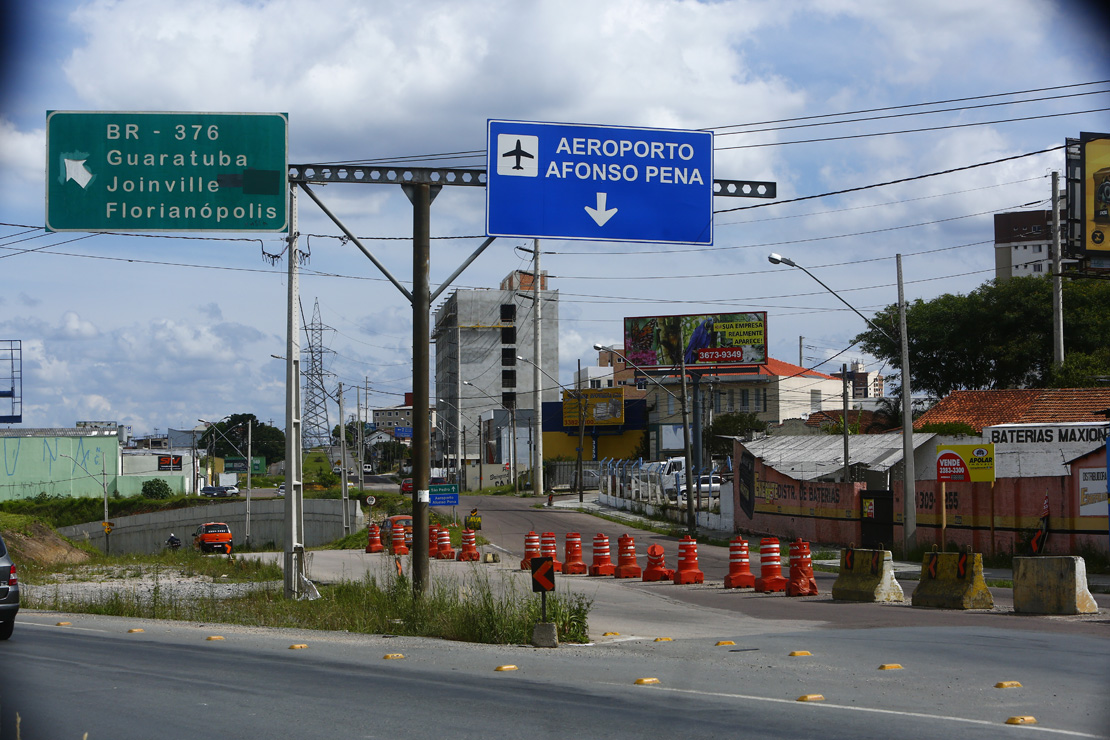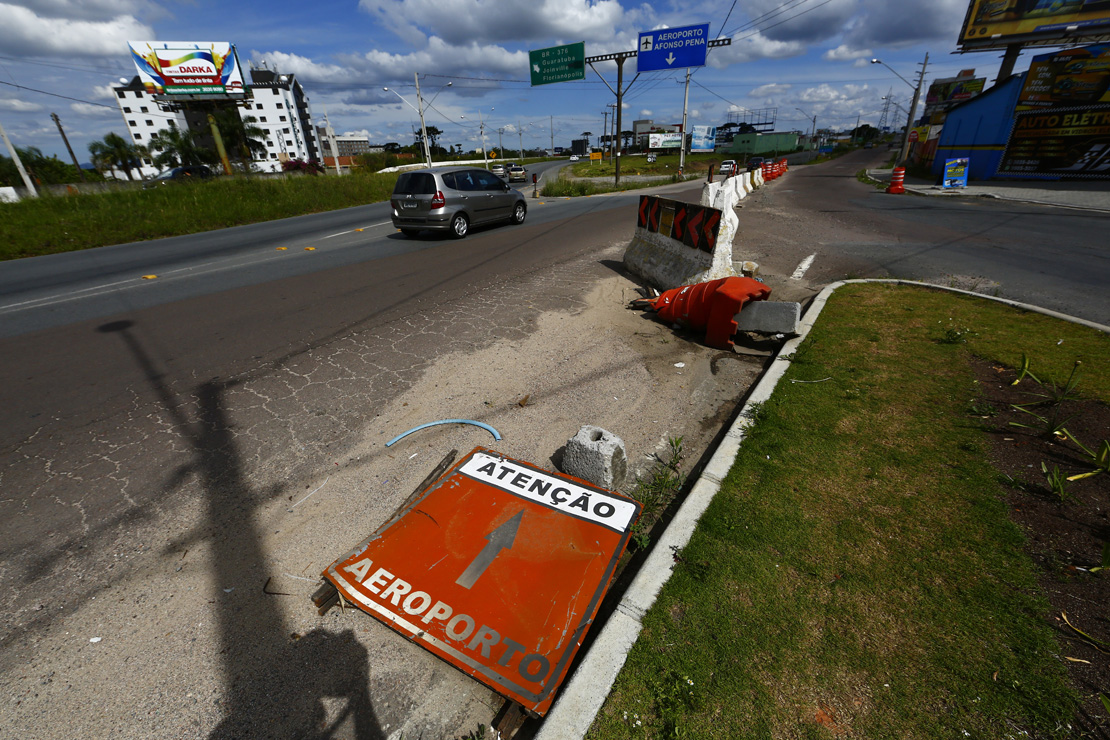 Já o motorista que segue no sentido aeroporto se depara, há meses, com um canteiro de obras. Cones, placas e bandeiras indicam a presença de trabalhadores. Mas tudo isso não passa de aparência. Toda a bagunça já se tornou parte do cenário na bifurcação entre a via que segue ao aeroporto Afonso Pena (pela Rua Comandante Aviador José Paulo Lepinski) ou a BR-376. A má sinalização oferece, além de tudo, um risco aos motoristas.