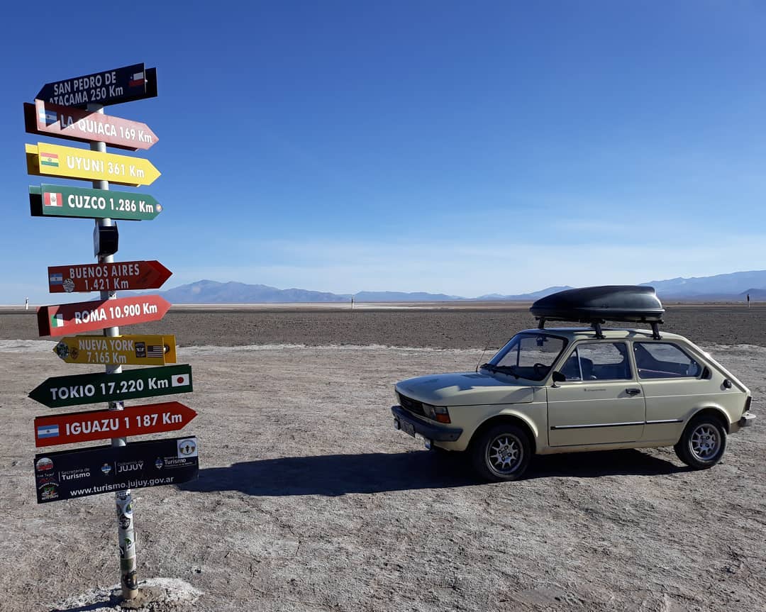fiat-147-7No dia seguinte, foi difícil sair do posto policial em Sierra Gorda. Alberto gostou dos novos amigos carabineros e eles não queriam deixar o viajante ir embora, pois também se divertiram muito com ele. Tanto é que ficaram amigos e Alberto fala com o comandante até hoje pelo WhatsApp. Mas ele teve que ir. Seguiu o conselho dos policiais de abastecer o tanque até a boca e ainda levar mais um reservatório extra que ganhou dos policiais, pois o caminho até Antofagasta era muito longo e quase não havia abastecimento no caminho.