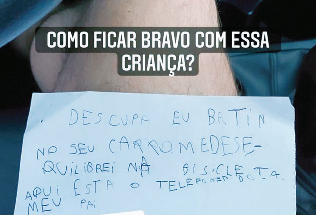 Já em casa, o menino não sossegou até que a situação fosse resolvida. “Ele chegou a pegar as suas economias para ver se teria dinheiro para pagar o conserto do carro. E lamentou que o dinheiro dele não iria dar. Então, sugeri que ele escrevesse um bilhete para deixarmos no para-brisa”.