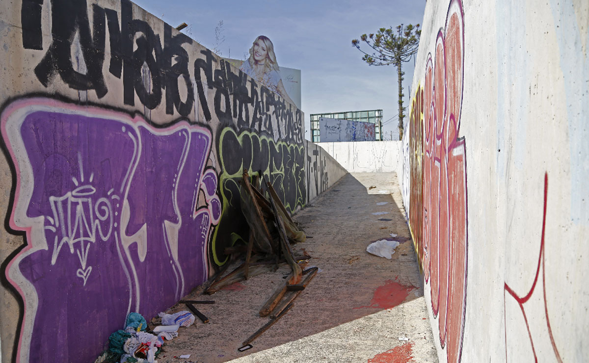Para facilitar a vida dos pedestres, uma passagem subterrânea foi construída ao lado do cruzamento da Avenida das Torres com a Avenida Rocha Pombo. No local há muitos materiais que sobraram das obras, como pedaços de madeira e telas de proteção. Faltam acabamento e sinalização. Lixo e pichações incomodam pedestres. “De dia dá para passar por aqui. À noite é muito arriscado, o pessoal ‘faz a festa’. E olha só o tanto de sujeira acumulada aqui”, conta o desempregado Tarcísio Gonçalves, 34, que mora na região e sempre passa pelo local.