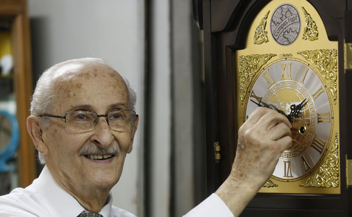 Para seu Woller, consertar relógios já não é um ofício há muito tempo. No auge, pelo menos cinco relógios eram consertados por ele, por dia. Se contarmos o trabalho desde os 12 anos, tirando um mês de fé- rias por ano, e imaginando que seu Salomão ainda trabalhasse nesse ritmo, ele já teria consertado mais de 91 mil relógios. Só que ele foi parando e os funcionários foram assumindo a missão. “Não faço mais. Para montar um relógio tem que se enxergar um pouco mais do que eu enxergo”, brinca. “Mas eu tenho um funcionário, aqui comigo, que vai morrer relojoeiro de tão bom que ele é. Então, está tudo resolvido”, conclui.