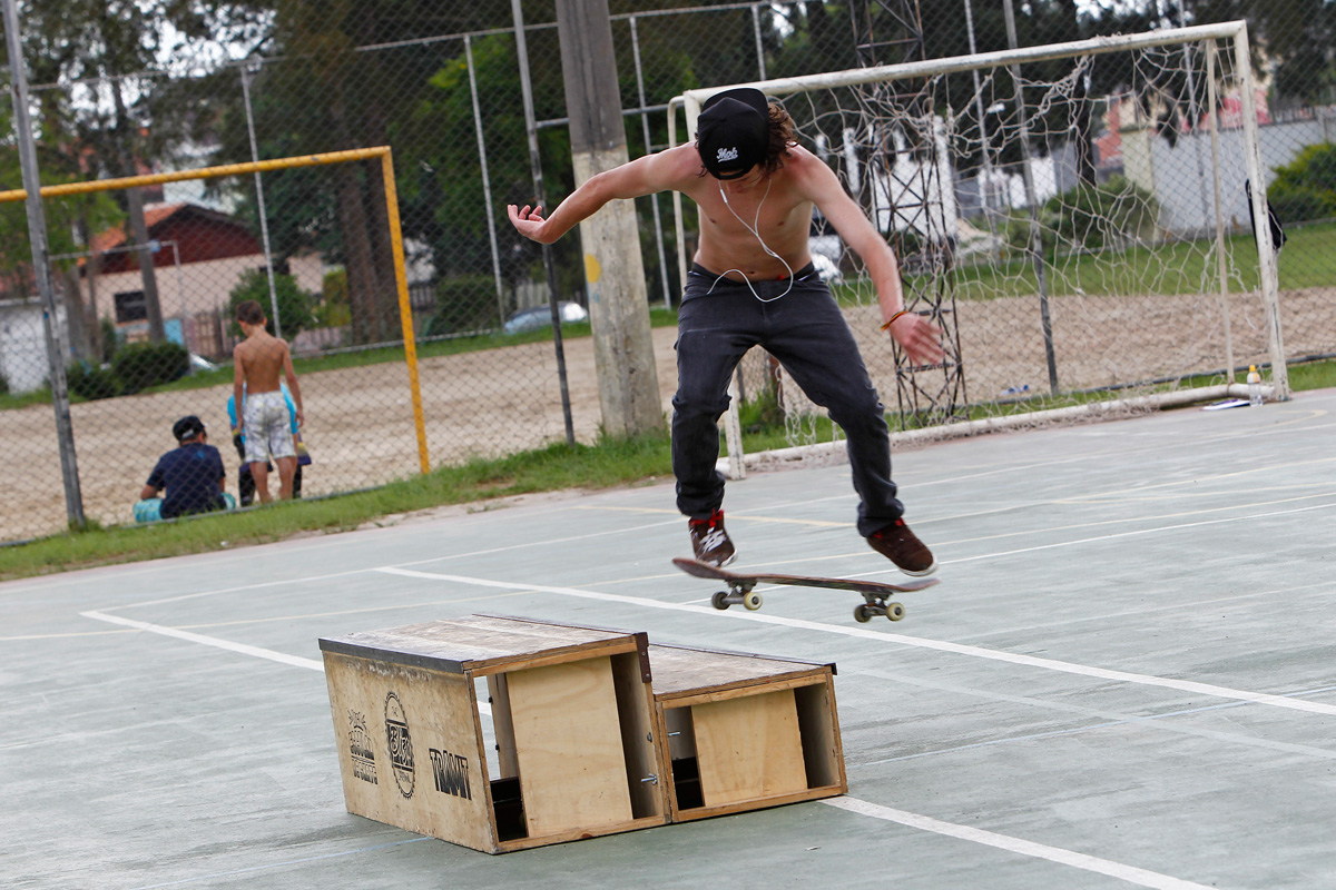 A proposta foi aceita e, há seis meses, nas segundas e quartas-feiras, das 15h às 20h, entram na quadra as caixas e corrimões móveis, construídos por ela e que ficam armazenados na loja, para as manobras da modalidade skate street. Com um projeto voluntário, Betinha conseguiu potencializar o uso de um equipamento público e criar um espaço de atividades no contraturno escolar para boa parte dos skatistas que usam a quadra.