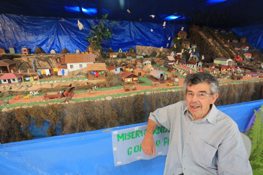 O sorridente Pedro Santana Pinto, 80 anos, é responsável há 47 anos pela construção e montagem de um presépio muito diferente do que estamos acostumados a ver pela cidade. Seu sonho de infância, ano após ano, foi tomando forma e com muita dedicação e amor hoje conta com mais de 200 peças e quase 100 casinhas, cascatas, grutas, igrejas, carros de bois, crianças e adultos. “Minha família era muito pobre, mas sempre tive vontade de ter um presépio só meu. Comecei com 1 metro quadrado e hoje o presépio tem 54 metros. Fui fazendo peça por peça, cada ano aumentando um pouco mais”, conta o aposentado operador de máquinas e marceneiro.
