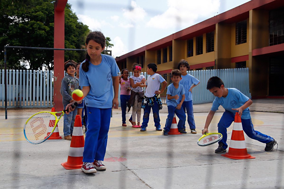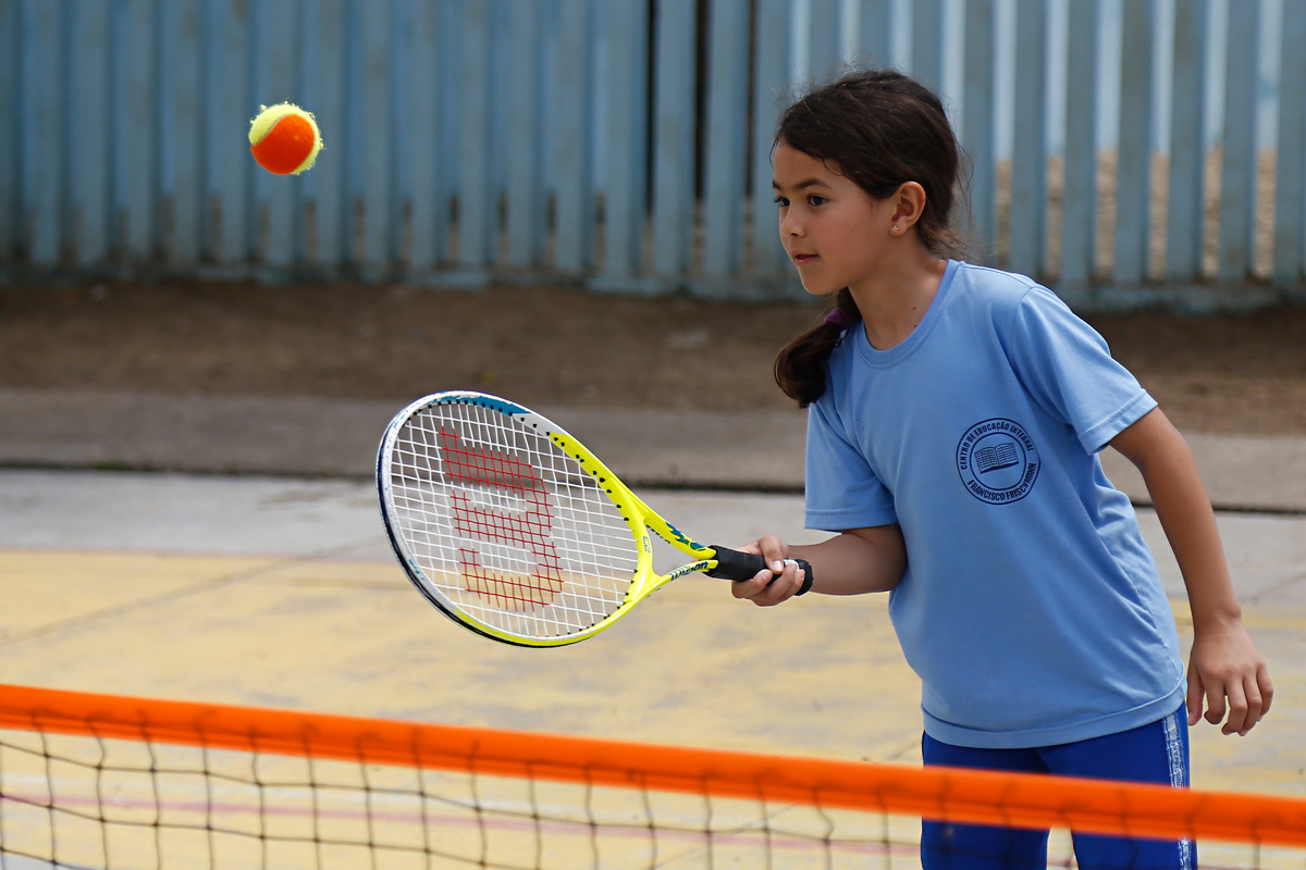 Os alunos do período integral da Escola Municipal Centro de Educação Integral Francisco Frischmann, no Pinheirinho, têm a oportunidade de praticar semanalmente um esporte considerado de elite: o tênis. Desde julho do ano passado, 16 turmas – cerca de 460 crianças – participam do projeto da rede municipal Tênis na Escola, e estão aprendendo a manusear a raquete e a rebater a bolinha. “Eu só conhecia da televisão, mas nunca tinha jogado. Estou gostando muito”, diz Nicole Camile da Silva, 7 anos, aluna do 2º ano.