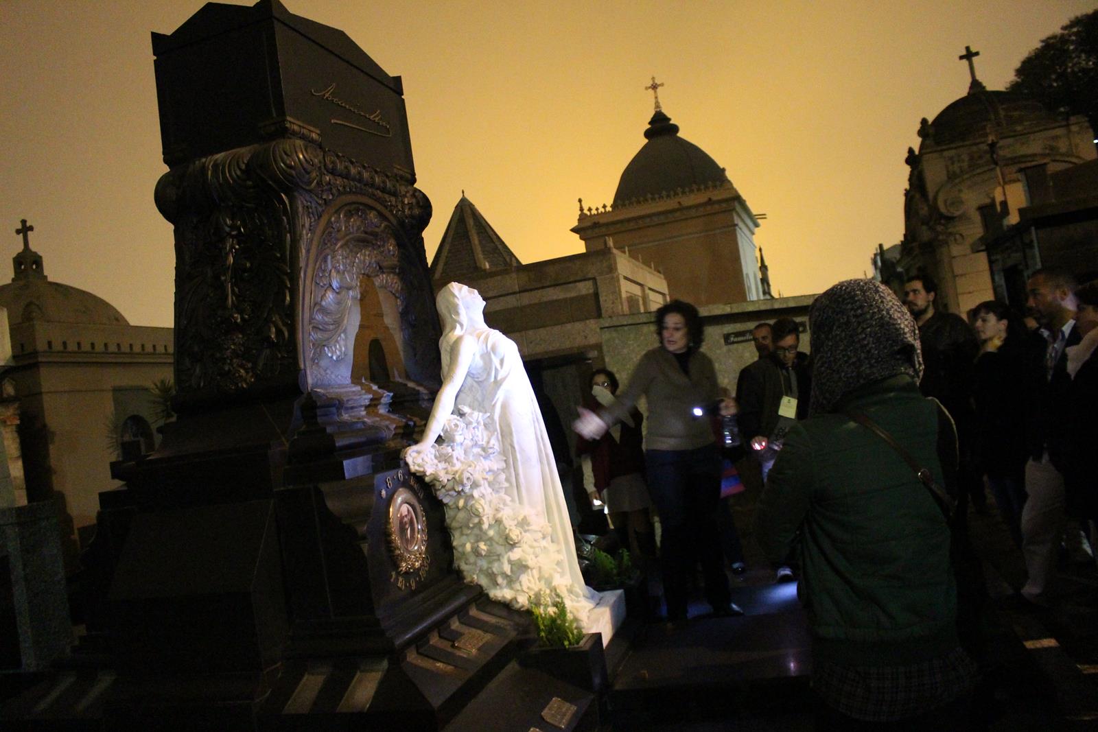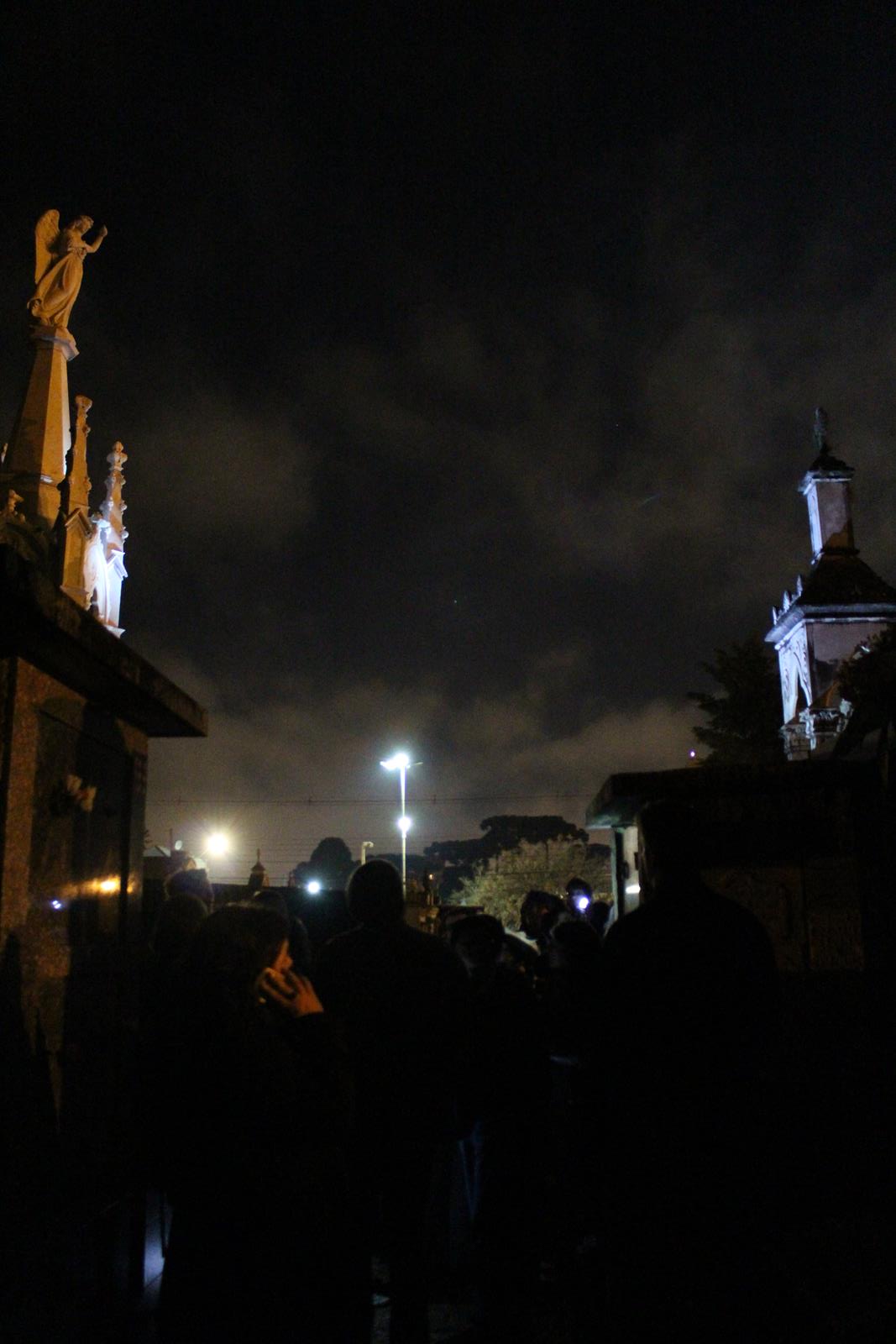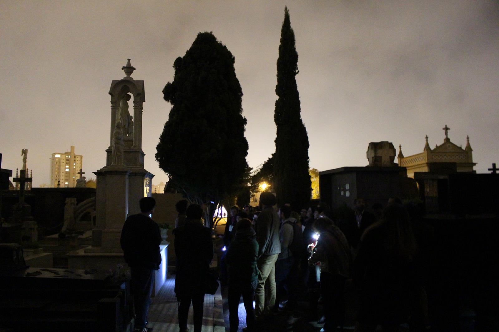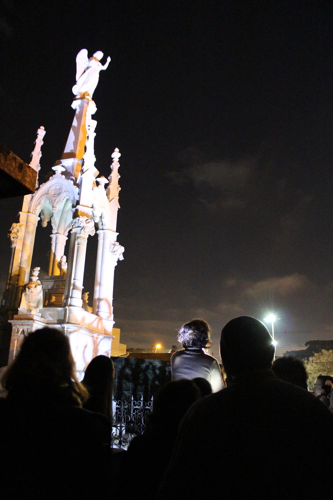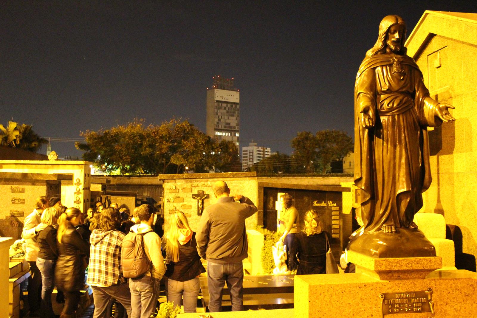 No trajeto pelo cemitério que abriga mais de 5 mil túmulos, as lanternas se projetam atentas a tudo o que Clarissa explica e mostra. Pouco a pouco, a história das construções vai se misturando ao histórico dos sepultados no cemitério como o do Barão do Serro Azul, o de André de Barros e José Hauer – todos que fizeram parte da história de Curitiba. Por ser no período noturno, talvez o sentido de percepção das coisas se faz ainda mais delicado e a atenção exigida permite que o visitante receba ainda mais informação.