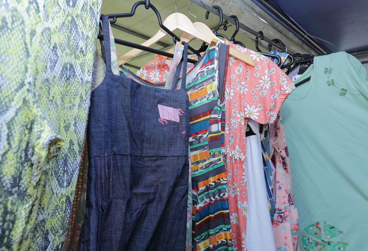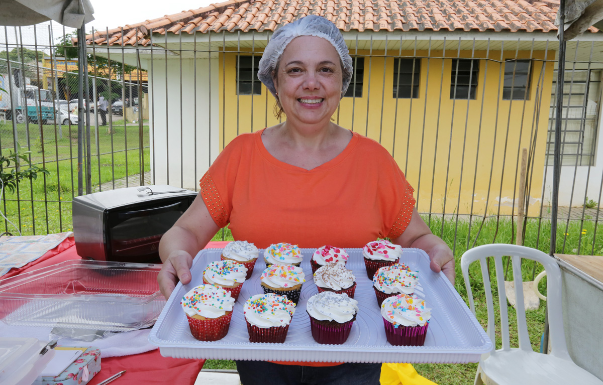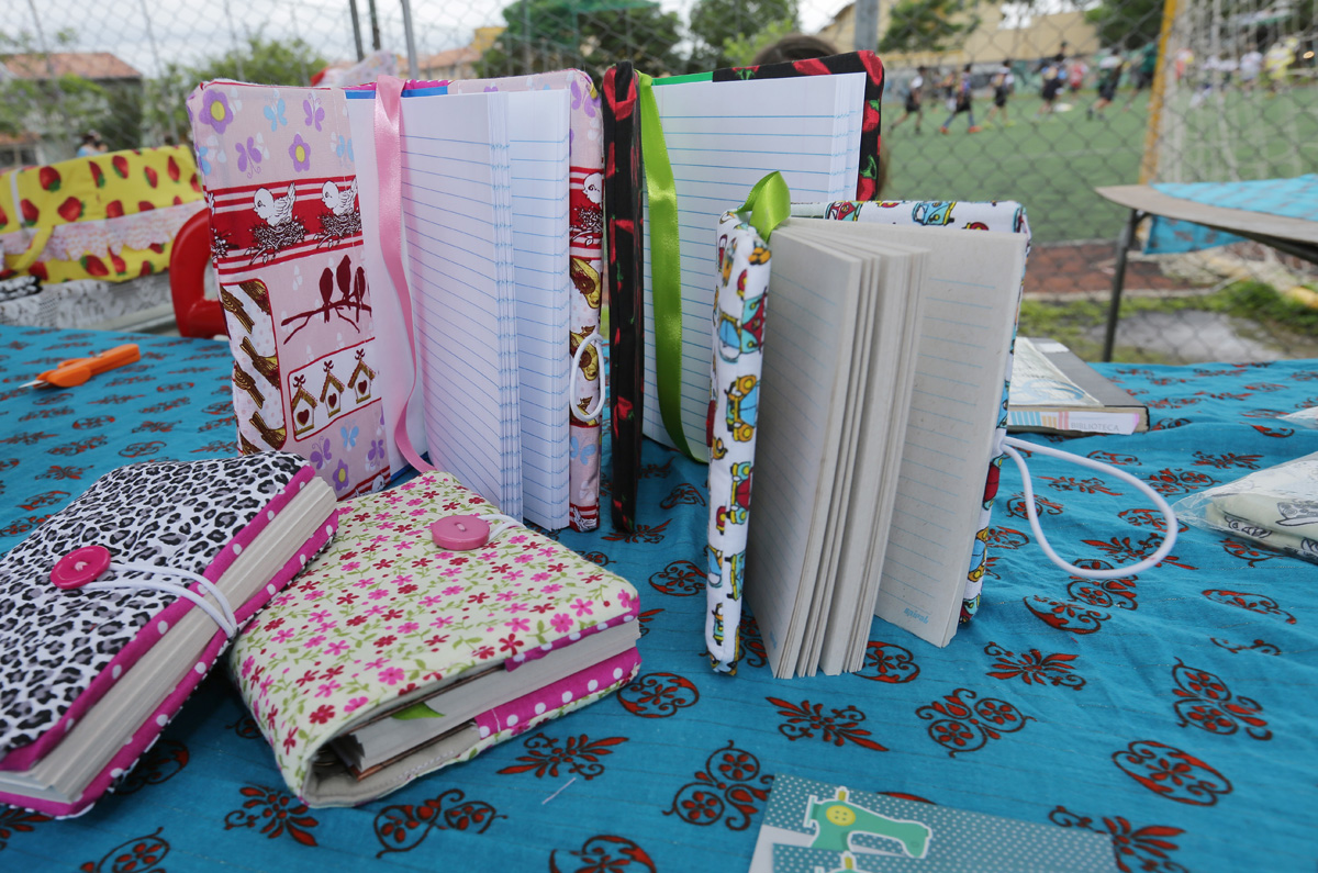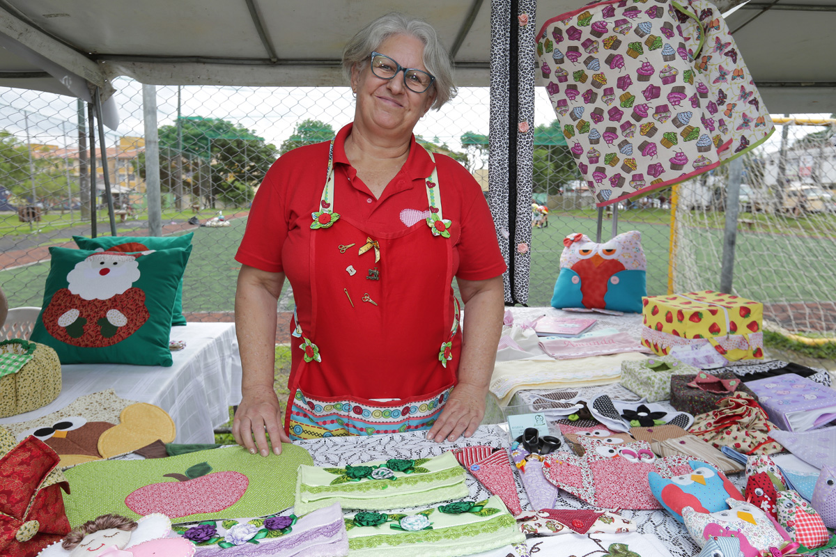 A artesã Maria Luisa Salles expõe seus quadros em scrapbook pela primeira vez. Antes, vendia as peças, que aprendeu a fazer como terapia, para os conhecidos e familiares que a visitavam. Agora, tem a chance de ver sua arte chegar a mais gente da vizinhança e complementar a renda familiar, como faz a companheira de barraca, Janete Krajewski Dalpério, com suas artes em madeira.