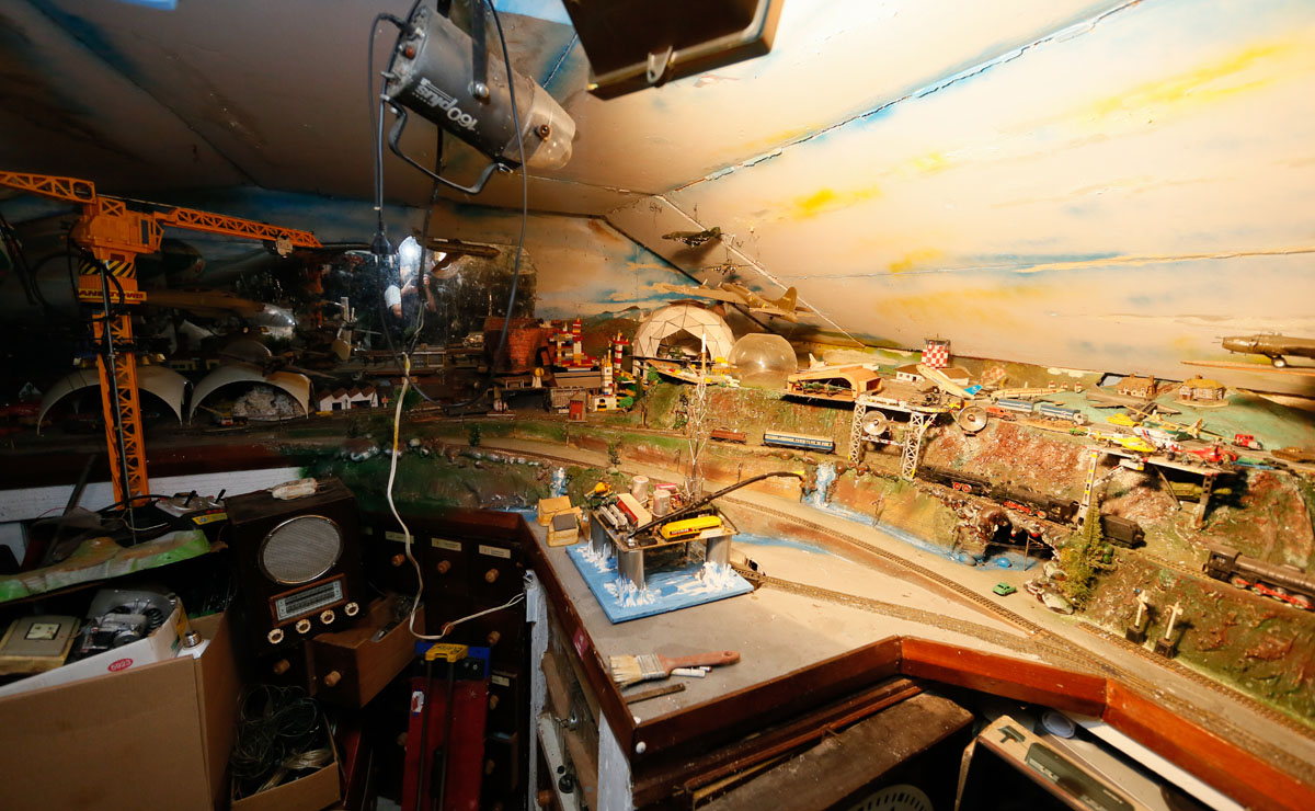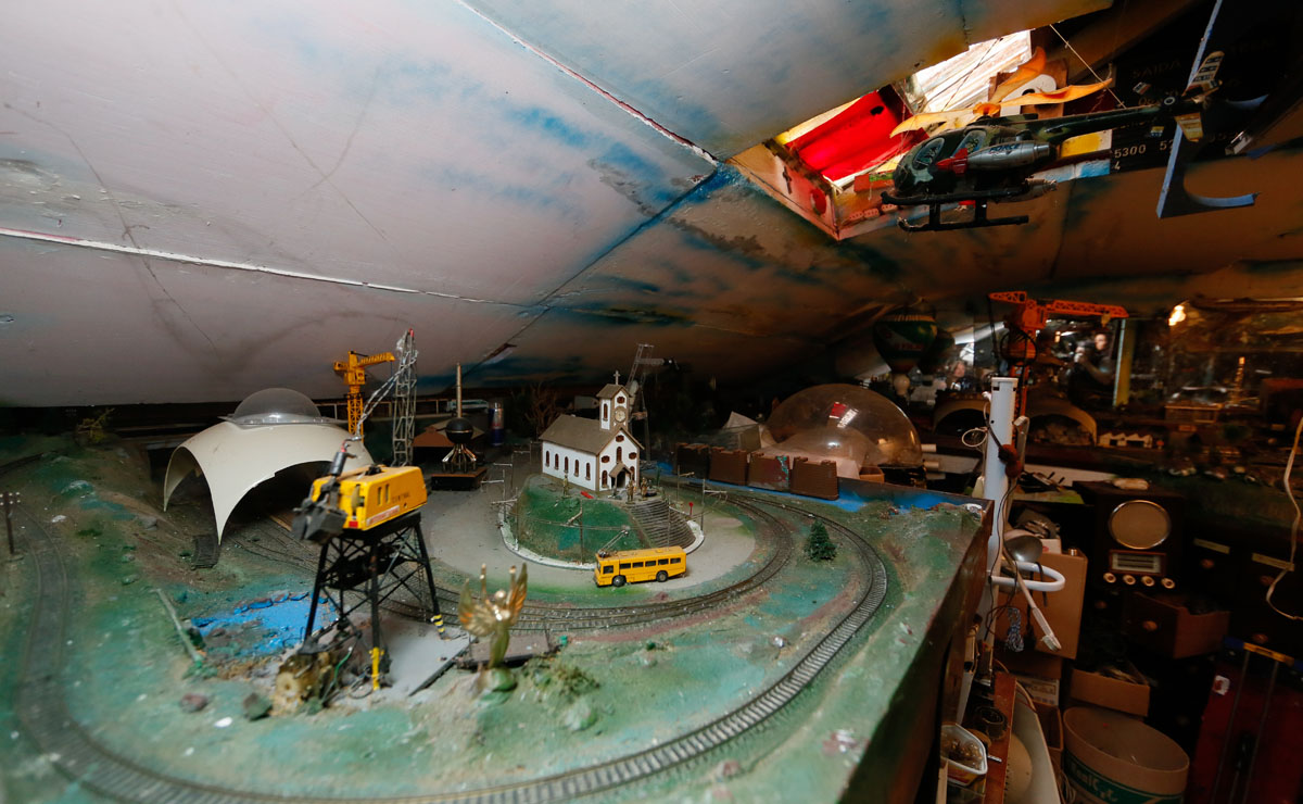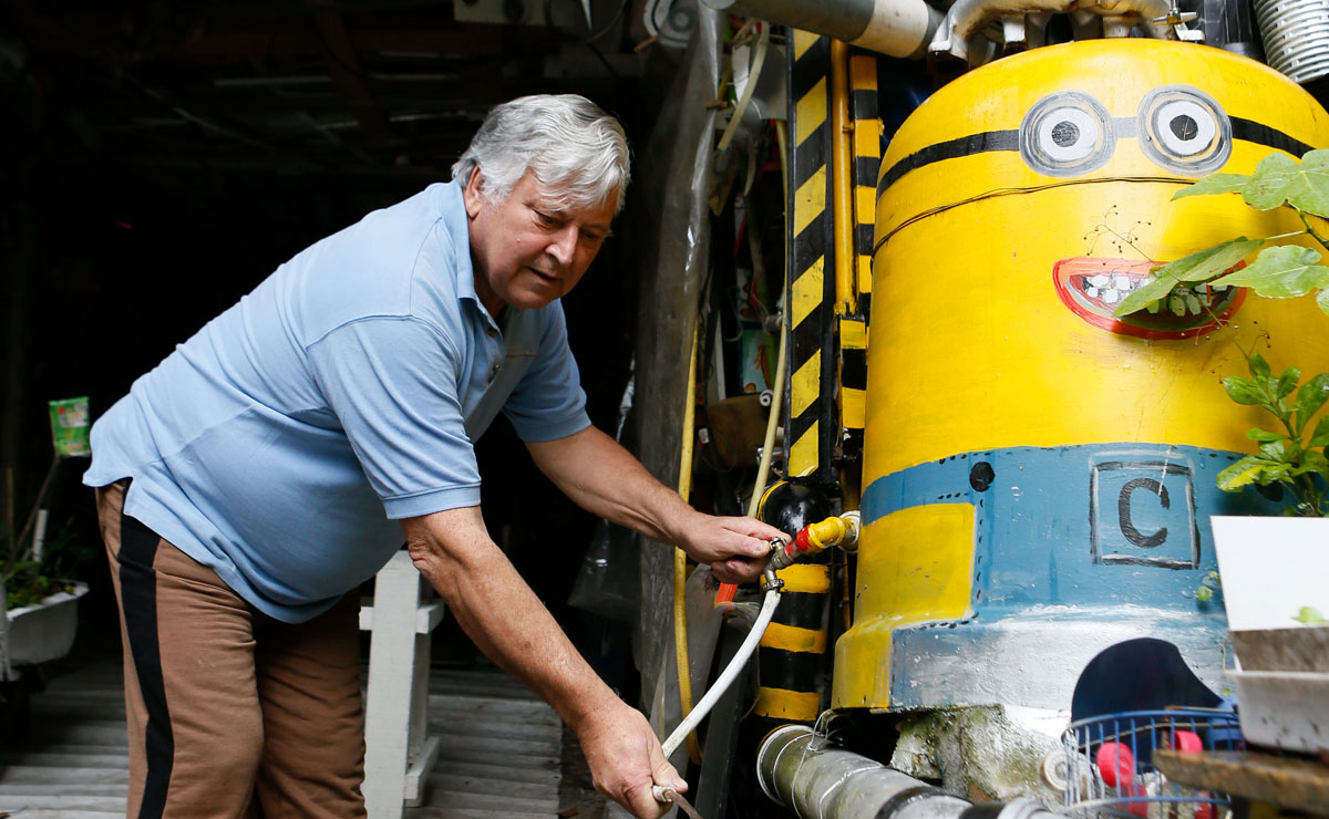 De fato, já do portão de entrada, as excêntricas invenções de Claiton despertam a curiosidade de quem passa em frente à casa. Entre as mais divertidas, o catalisador de água de chuva em forma de “minion” se destaca. Porta adentro, mais surpresas: um medidor de umidade (feito por ele mesmo), uma luneta gigante e um exército de miniaturas. Pelas paredes, prateleiras de carrinhos, brinquedos antigos e itens de coleção. No teto, uma tropa de aviões em miniatura obriga quem passa a baixar a cabeça. “Cada objeto tem uma história diferente. Alguns eu ganhei, outros eu achei. Alguns eu encontrei no lixo. É impressionante ver o que as pessoas jogam fora”, desabafa.