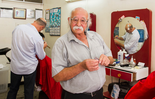 É possível também perceber os laços com o passado no acabamento do corte de Garcia. Ele ainda guarda sua navalha e mantém a lâmina impecável, afiando na borracha para o próximo cliente. “Hoje uso máquinas, pois é muito mais prático para fazer o corte. Mas antes de terminar, passo a navalha porque fica mais bonito, sem nenhuma ponta”, conta o barbeiro.