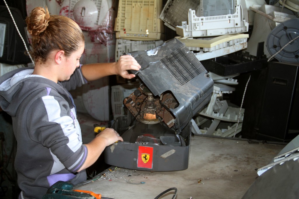 Almeida é proprietário da empresa que recicla eletrônicos e dá destino final para os produtos. Em alguns casos, a televisão velha ou o computador que não funciona mais são doados ou é feita negociação para a compra do produto. Cada item é desmontado e os diferentes materiais são separados. Plástico, vidro, ferro, cobre, placas e fios são destinados a outras empresas, que dão novos usos a eles. Por mês, passam pelo local 30 toneladas de materiais.