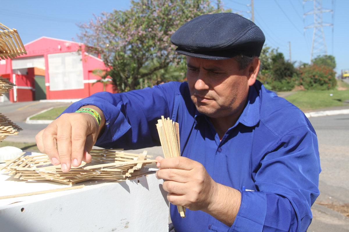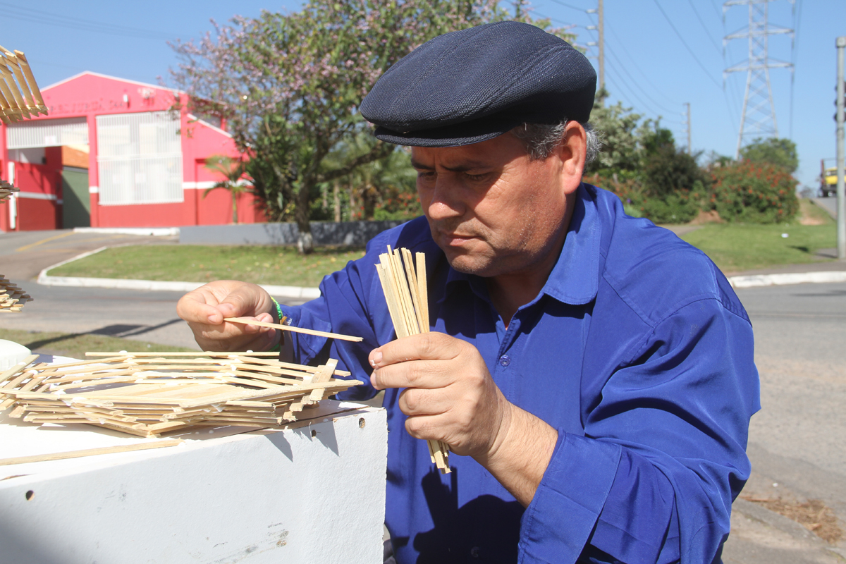 Depois de tirar da gaveta o projeto, ele aprimorou a ideia e passou a fazer cestas de pães e frutas e cachepô pra plantas com palitos de sorvete de Itu. “Eles são maiores, como tudo que vem de lá, exceto eu, que sou uma amostra grátis”, brinca Aguinaldo, que nasceu em Itu (SP), mas vive hoje com a família em São José dos Pinhais.