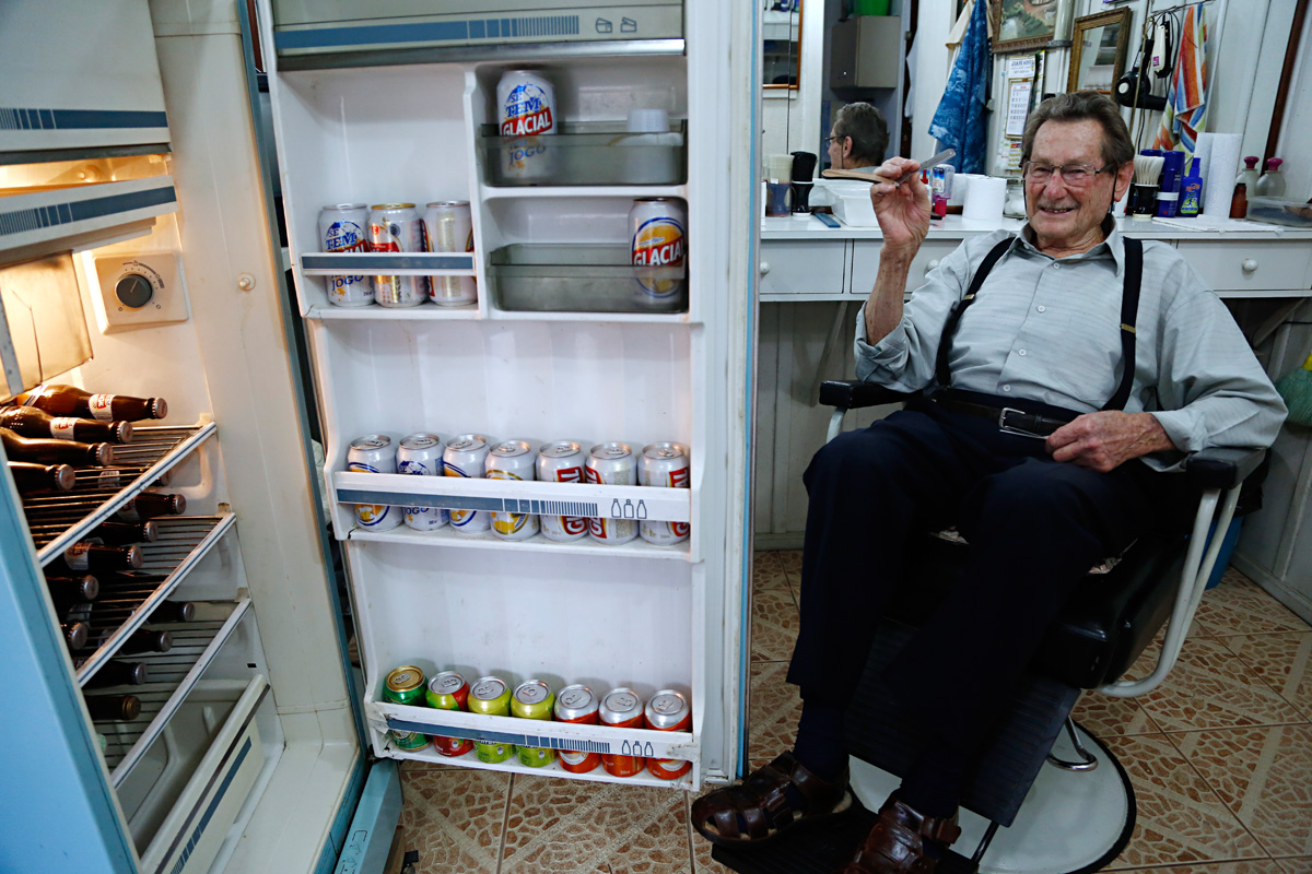 “Já cortei cabelo de criança que já cresceu, casou e trouxe o filho”, diz o barbeiro, que atende apenas homens, com exceção de uma única cliente mulher. Ele recepciona seus clientes com uma geladeira azul – daqueles modelos antigos, que foi comprada na loja Hermes Macedo por 300 cruzeiros na década de 70 – cheia de cerveja.