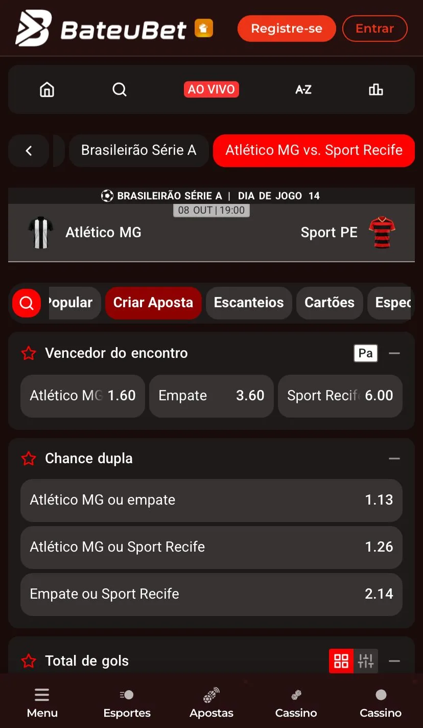 Para usar o recurso na Bateubet, é só escolher o evento desejado e selecionar a opção Criar Aposta.