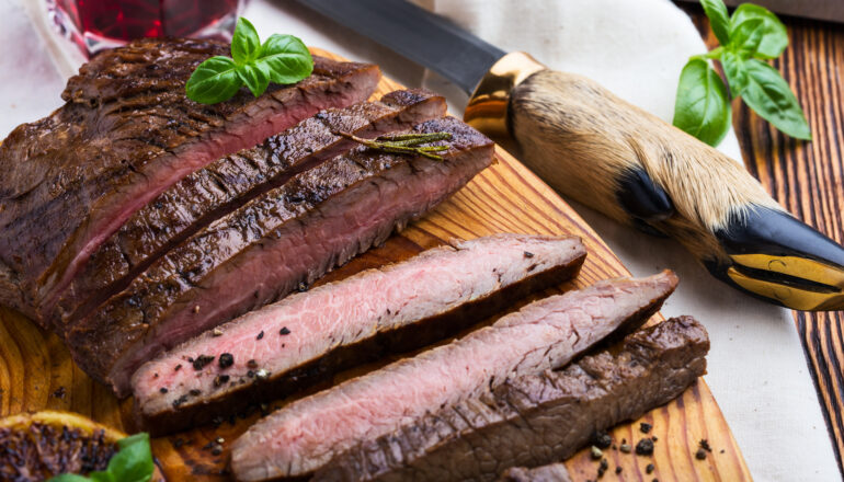 A carne fica bem grelhada por fora e por dentro, mas o interior fica um pouco rosado. Você só precisa assar no máximo a 73ºC por até 9 minutos.