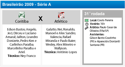 Por isso, concentração total e o empurrão da torcida serão usados para buscar a vitória, que amenizará a frustração nas comemorações do centenário. Para tanto, o Coxa conta com o ótimo aproveitamento do técnico Ney Franco no Alto da Glória e a presença mais do que garantida do craque Marcelinho Paraíba e do ídolo Ariel.