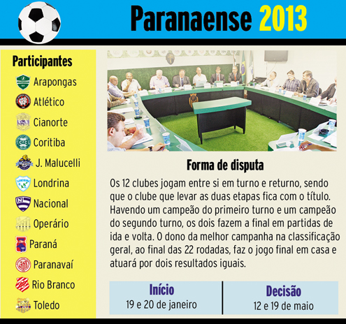 O arbitral do Campeonato Paranaense realizado ontem, na sede da Federação Paranaense de Futebol, com os 12 clubes que disputarão a Primeira Divisão de 2013, confirmou a repetição da fórmula de disputa que está em vigor desde 2011. Houve alteração apenas a fase final da competição. Agora, o saldo de gols passará a contar na decisão, desde que haja necessidade de realização das duas partidas, em caso de haver um campeão em cada turno. Com isso, a disputa por pênaltis, como ocorreu este ano, fica descartada. Se um dos participantes levar os dois turnos será declarado campeão direto. A primeira rodada terá início dia 19 de janeiro e as finais estão marcadas para 12 e 19 de maio.