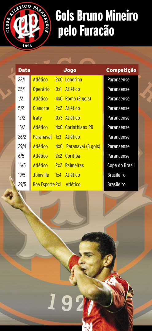 O atacante, hoje na Portuguesa, mesmo tendo deixado o Furacão em julho, ainda é o artilheiro do clube na temporada, com 15 gols. Para a diretoria, não foi fácil abrir mão do jogador. Segundo o comando do clube, seu empréstimo para a Lusa foi a contragosto, mas para atender a uma insistência do treinador Jorginho. “O que acontece é que a própria torcida não gostava do Bruno Mineiro. Aí fica difícil, e ele não estava sendo aproveitado. Ele foi nosso artilheiro no Paranaense, e é nosso artilheiro ainda. Mas o Jorginho não quis aproveitar. Como a Portuguesa queria ele, fizemos a troca”, conta o vice-presidente de futebol do Atlético, João Alfredo Costa Filho.