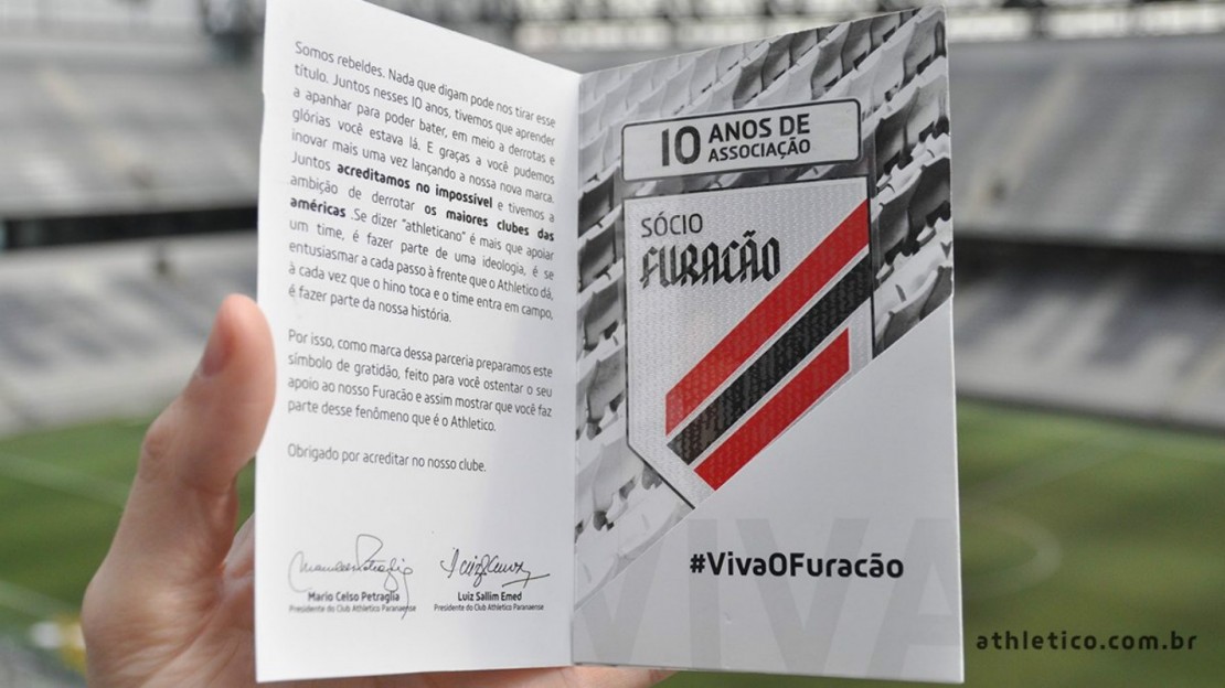 O Athletico lançou esta semana uma ação de agradecimento aos torcedores que aderiram ao plano de sócios do clube em 2009. Quem se manteve associado neste período ganhou um patch oficial do Furacão. Uma ‘recompensa’ diante de tantos problemas nesta década de projeto.