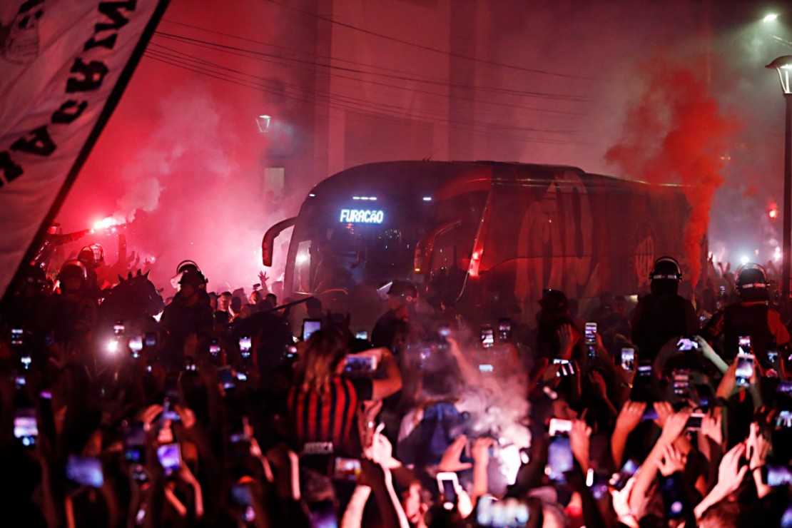 Para recepcionar o time com toda a importância que o elenco atleticano merecia, a torcida fez uma ‘rua de fogo’ vermelha na chegada da equipe ao estádio. Com fogos de artifício, sinalizadores e muito barulho os aficionados rubro-negros deram o recado de que estariam empurrando o time em campo na base do grito. Os jogadores, dentro do ônibus, batiam na janela no ritmo das canções, mostrando que estavam entendendo a mensagem e que corresponderiam ao apoio.