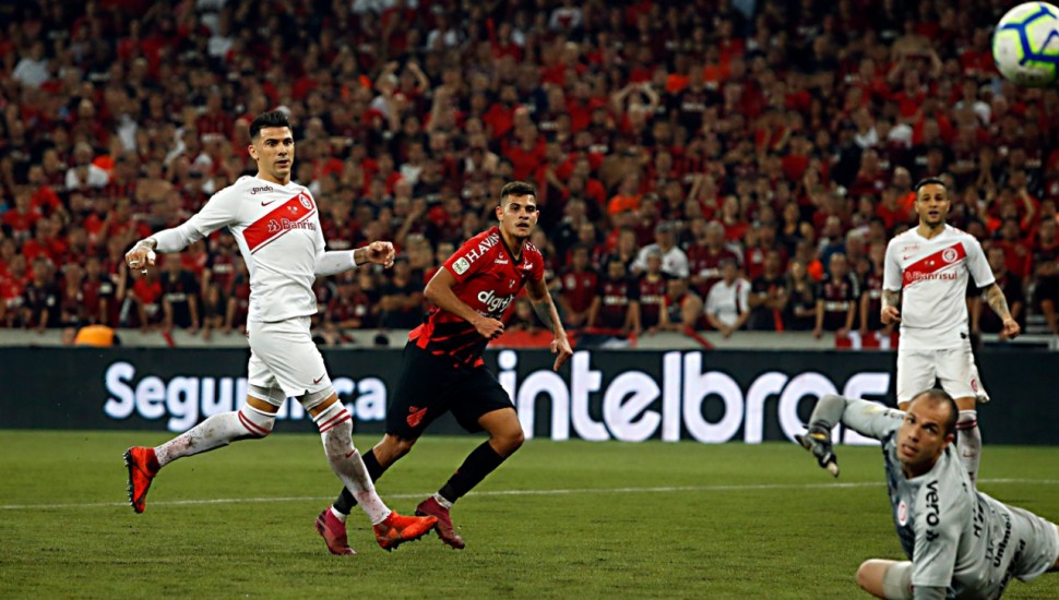 Diante da pressão do Athletico, o Internacional recuou. Passou a marcar todo no campo de defesa para tentar conter o ímpeto do Furacão. Mas as chances seguiram aparecendo. Aos 13 minutos, depois da boa troca de passes pela esquerda, Rodrigo Moledo afastou mal, Rony ficou com a sobra, chutou e quase fez um golaço.