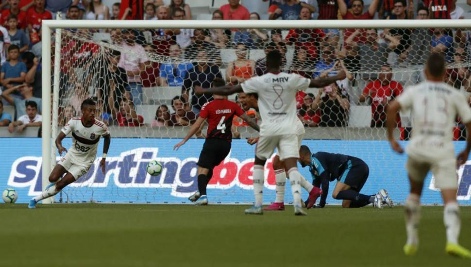 O Rubro-Negro abusou da sorte e tomou o gol aos 44. O goleiro Léo e Wellington, na tentativa de sair jogando, erraram feio e, aproveitando da lambança do sistema defensivo atleticano, Bruno Henrique roubou, mandou para o gol e abriu o placar na Arena da Baixada.