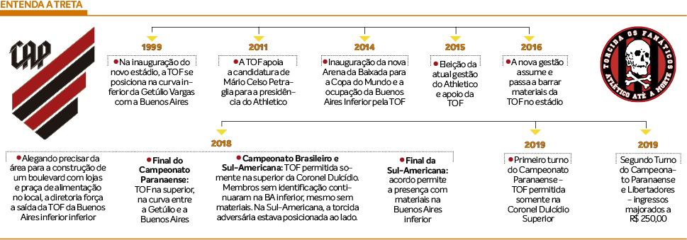 A briga entre a diretoria do Athletico e a torcida organizada Os Fanáticos (TOF) sobre o lugar dentro da Arena da Baixada que o grupo deve ocupar tem um novo capítulo. Quando parecia que uma trégua tinha sido firmada entre as partes, um novo desacordo surgiu. A cúpula rubro-negra aumentou o preço dos ingressos no setor Buenos Aires Inferior para dificultar a permanência dos membros da TOF na área.