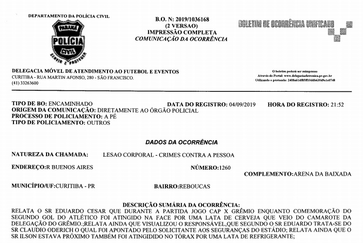 Segundo o boletim de ocorrência registrado na Delegacia Móvel de Atendimento a Futebol e Eventos (Demafe), que a Tribuna do Paraná teve acesso, Eduardo César Gava relata que “foi atingido na face por uma lata de cerveja que veio do camarote da delegação do Grêmio”. Segundo a acusação, o responsável foi Cláudio Oderich, um dos seis vice-presidentes do Conselho de Administração do clube gaúcho.