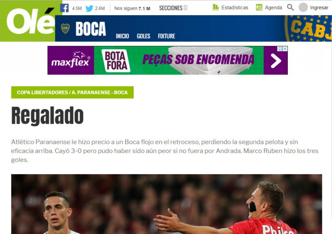 Por outro lado, o La Nacion não poupou críticas ao time argentino e postou “Um péssimo passo do Boca no Brasil. Com três gols de Marco Ruben, Athletico o superou no jogo e na atitude”.