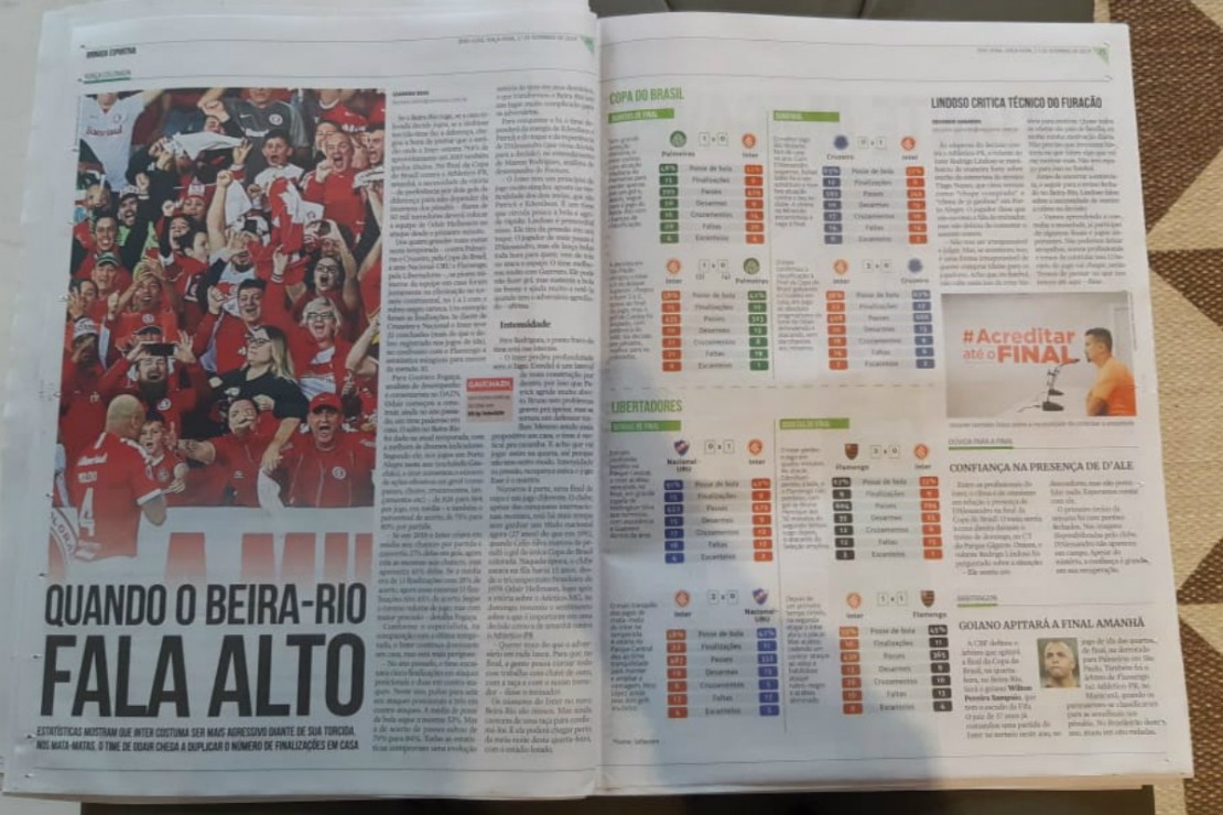 A edição do Zero Hora dá destaque total à decisão no seu caderno de esportes. A reportagem principal traz os números do Colorado quando joga em casa nos duelos mata-matas. Quando decidiu vagas dentro de casa este ano, em competição nacional e na Libertadores, o time gaúcho conseguiu ter desempenhos que animam o seu torcedor.