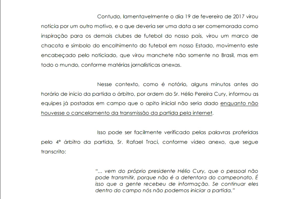 O pedido de abertura de processo também destaca que, diferente da versão da falta de credenciamento para a não realização do jogo, o quarto árbitro, Rafael Traci, foi claro ao comunicar à cúpula dos dois clubes que o “apito inicial não seria dado enquanto não houvesse o cancelamento da transmissão da partida pela internet”. Para reforçar a alegação, há a transcrição do vídeo que registra o momento em que Traci deixa explícita a motivação para a não realização do jogo.