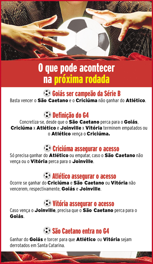 Por falar em campeão, a rodada que vem pode definir também quem fica com o título da Série B. Se o Goiás vencer o São Caetano veste a faixa, independentemente de outros resultados. Se perder para o Azulão, e o Criciúma ganhar do Atlético, quem fica com uma mão no troféu é o clube catarinense. Já o Furacão, desde que ganhe do Tigre e o São Caetano bata o Goiás, também entra na briga para terminar a Segundona dando a volta olímpica, assim como o Vitória, se vencer o Joinville. Não é à toa que a 37.ª rodada já é tratada com uma das mais empolgantes da história da Série B.