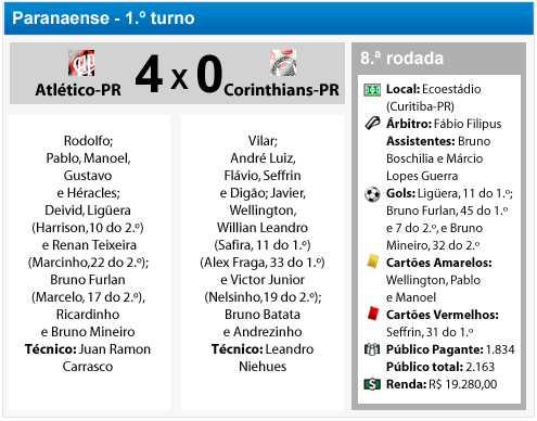 Com um bom futebol, o Atlético passou por cima do Corinthians Paranaense e goleou o adversário por 4 a 0, na tarde desta quarta-feira (15), no Ecoestádio, em Curitiba. Com o resultado, o Furacão se mantém na ponta da tabela.
