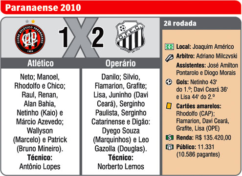 O time visitante queria mais e por milagre não fez o segundo aos 42. Lisa dominou a bola livre quase na pequena área e perdeu um gol feito. No fim da partida o gol da vitória do time de Ponta Grossa. Lisa recebeu com liberdade dentro da área e fuzilou o goleiro Neto. Final: Atlético 1, Operário 2.