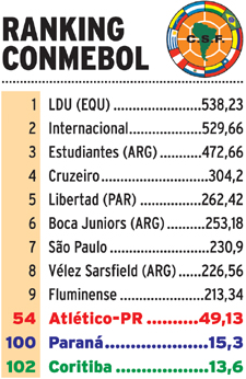 A boa fase do Coritiba ainda não chegou ao ranking da Confederação Sul-Americana de Futebol (Conmebol). Atual sensação do futebol brasileiro, o Coxa é apenas o 102.º na lista divulgada ontem e aparece atrás dos rivais paranaenses.
