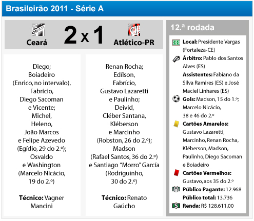 O Atlético enfrentou a equipe do Ceará, na noite desta quinta-feira, em jogo válido pela 12ª rodada do Brasileirão, fez um bom jogo, mas acabou castigado no fim e perdeu por 2 a 1. Com o resultado, o Furacão segue na última posição na tabela de classificação, com 5 pontos ganhos. Próximo desafio do time comandado por Renato Gaúcho será o Santos, de Neymar e Ganso, domingo, às 18h30, na Arena.