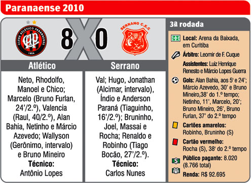 O Atlético goleou o Serrano na noite deste sábado (23), na 3ª rodada do Campeonato Paranaense 2010. O jogo foi na Baixada, em Curitiba. Foram oito gols e nenhum do time de Prudentópolis, que tentou jogar aberto e viu o Rubro-Negro passear em campo. O saldo de gols foi até o momento o maior na edição de 2010 do Estadual, e um dos maiores em jogos na Arena da Baixada. Com o placar, o Furacão soma agora 4 pontos ganhos e pula provisoriamente para a 3ª posição na tabela. O Serrano permanece com apenas 1 ponto e no 13º lugar.