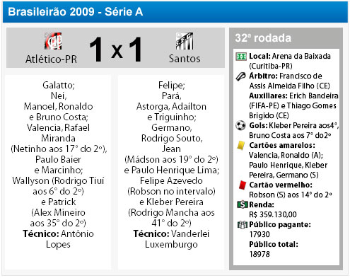 Aos 32, Kleber Pereira recebeu na área e bateu cruzado: a bola passou perto. O Furacão tentou a virada até o fim, mas o Santos se fechou bem e garantiu o empate. Final: Atlético 1, Santos 1.