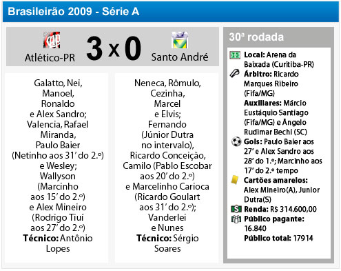 Atlético faz goleada em cima do Santo André na partida do final da tarde deste domingo (19), na Arena da Baixada, em Curitiba.Alex Sandro, Paulo Baier e Marcinho marcaram os gols da partida.