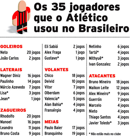 A derrota de domingo do Atlético para o Guarani, por 1 x 0, foi pela 21.ª rodada do Brasileiro e o Atlético levou a campo a 21.ª escalação diferente. A cada jogo é como se o Atlético reiniciasse a campanha no campeonato, em busca do entrosamento da “nova equipe”.